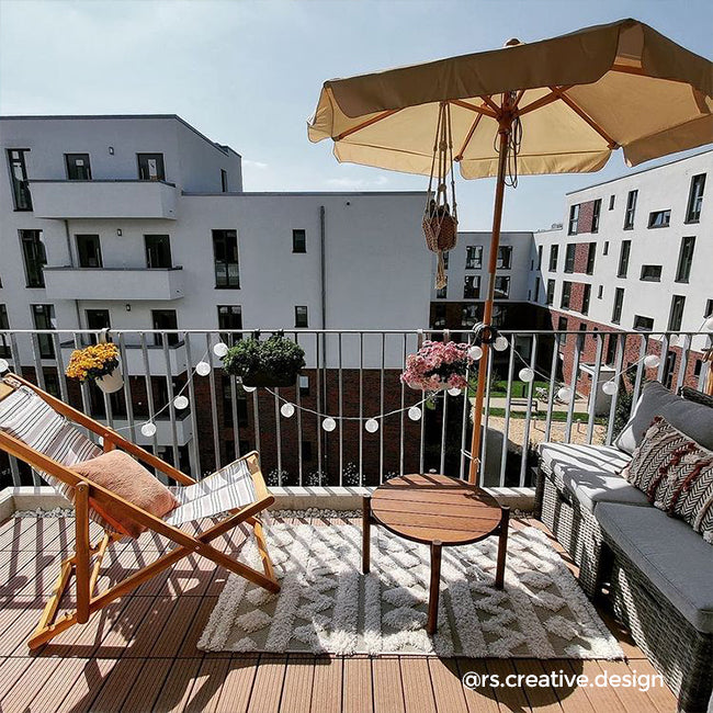 Wenn Sie keinen klassischen Garten, aber einen Balkon haben, haben sie auch auf diesem nahezu unbegrenzte Möglichkeiten. Stellen Sie ein kleines Balkonset auf, am besten in Kombination mit einem Sonnenschirm. *SONGMICS Seitenmarkisen sind besonders hilfreich, wenn Sie Ihren Balkon vor neugierigen Blicken von außerhalb schützen möchten. Ganz nach Ihrem Geschmack können Sie auch einige dekorative Elemente hinzufügen.
