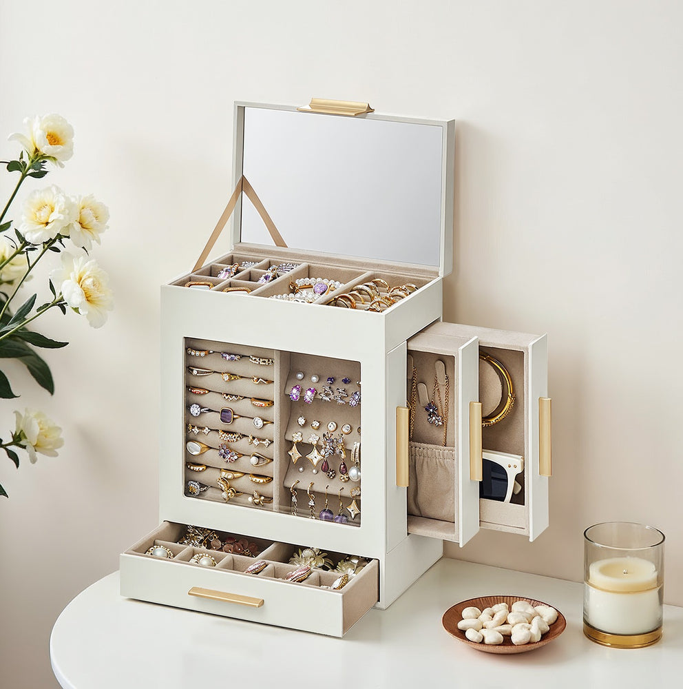 Schmuckkasten 5 Ebenen großer Spiegel wolkenweiß-metallisches Gold