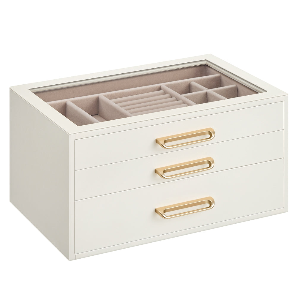 Schmuckkästchen Schmuckbox 3 Ebenen Glasdeckel 16 × 24 × 12,5 cm cremeweiß